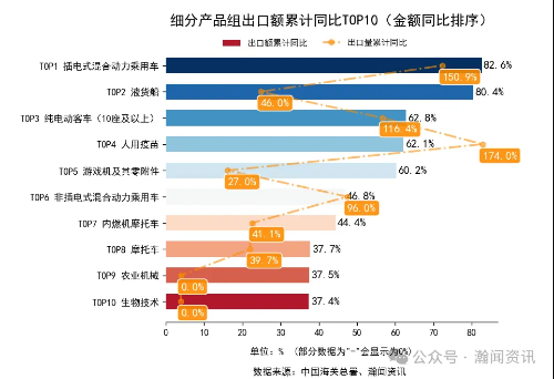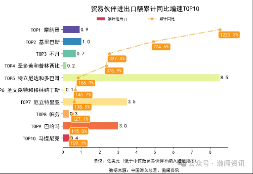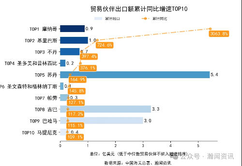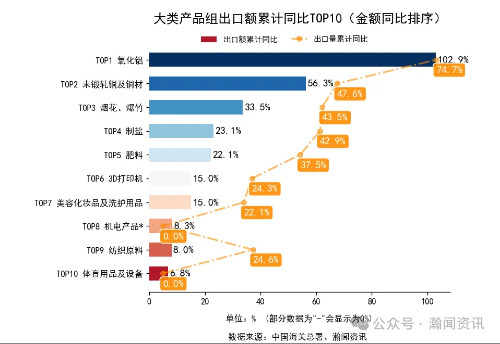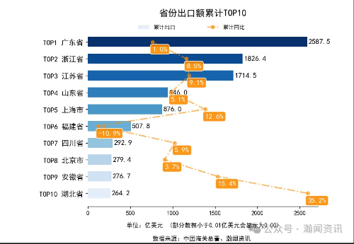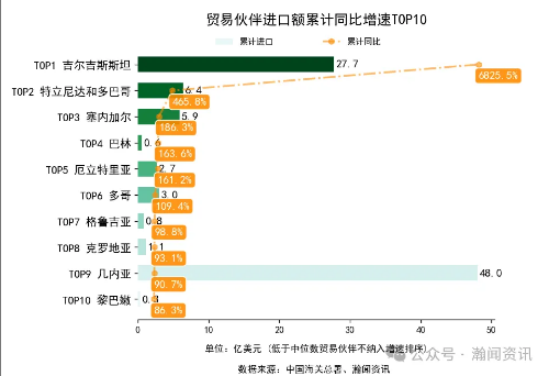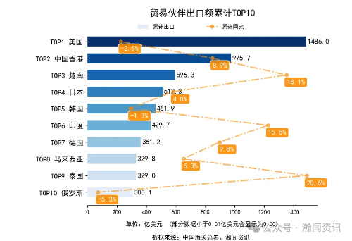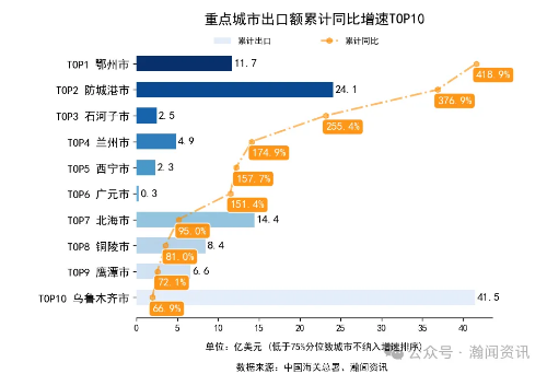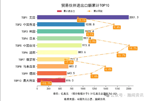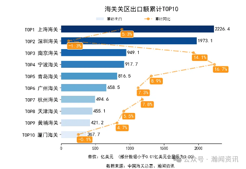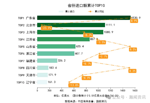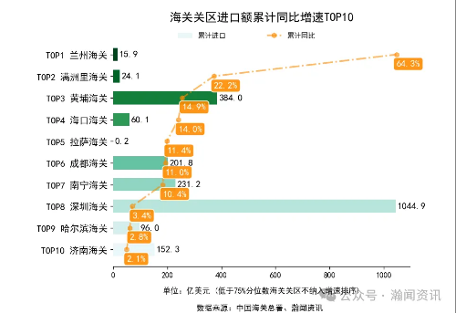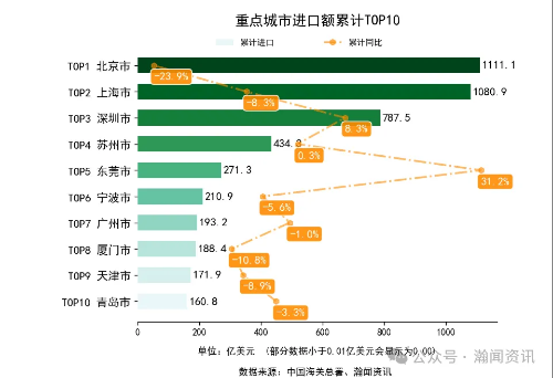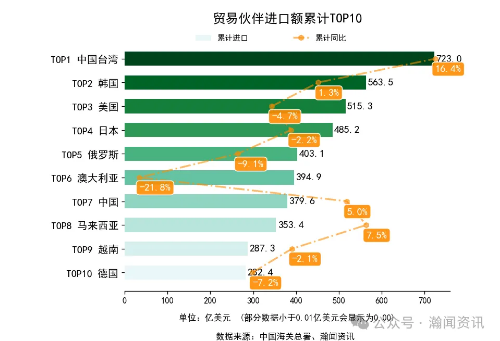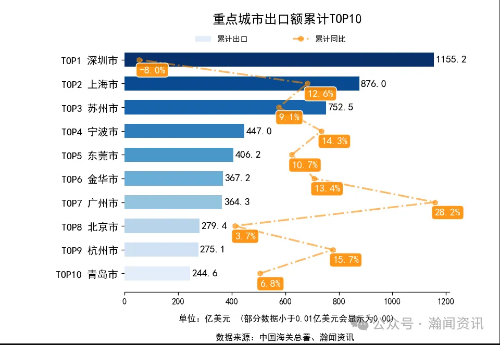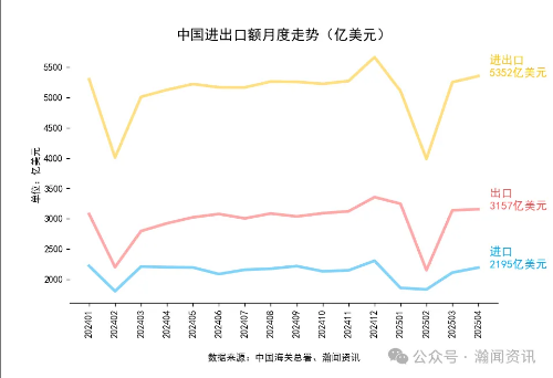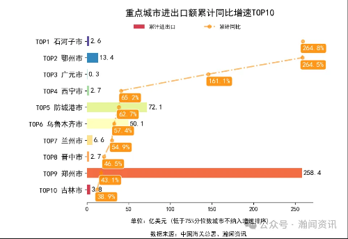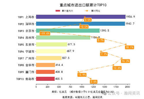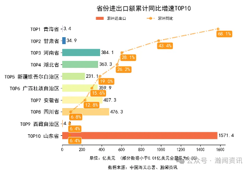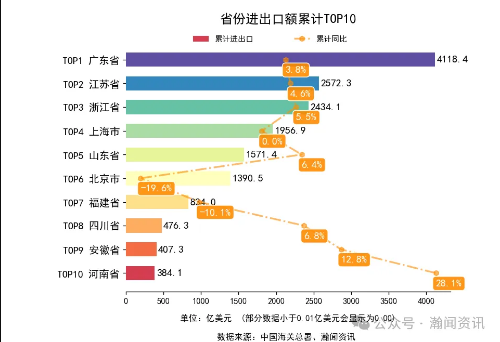 01 中国进出口概览 5月18日,海关总署公布2025年1-4月数据,以美元计,1-4月我国进出口总额19694亿美元,同比增长1.3%。其中,出口11691亿美元,同比增长6.4%;进口8003亿美元,同比下降5.2%。 4月单月,进出口5352亿美元,同比增长4.6%,环比增长2.0%。其中,出口3157亿美元,同比增长8.1%,环比增长0.6%;进口2195亿美元,同比下降0.2%,环比增长3.9%。 02 中国省市进出口排名 前4月,全国31省市(不含港澳台,下同)中,累计出口额同比增长的有23个省市,下降的有8个省市。增长最高是青海省,出口3.0亿美元,累计同比138.4%。累计进口额同比增长的有10个省市,下降的有21个省市。增长最高是西藏自治区,进口0.7亿美元,累计同比44.1%。 03 中国重点城市进出口排名 前4月,全国128个重点城市中,累计出口额同比增长的有93个市,下降的有35个市。增长最高是鄂州市,出口11.7亿美元,累计同比418.9%。累计进口额同比增长的有51个市,下降的有77个市。增长最高是石河子市,进口0.1亿美元,累计同比621.4%。 04 中国贸易伙伴进出口排名 前4月,全国251个贸易伙伴中,累计出口额同比增长的有188个,下降的有63个。增长最高是摩纳哥,出口0.9亿美元,累计同比3063.8%。累计进口额同比增长的有124个,下降的有127个。增长最高是吉尔吉斯斯坦,进口27.7亿美元,累计同比6825.5%。 05 中国大类产品组进出口排名 前4月,大类产品组中,出口金额累计同比增长的有23个,下降的有21个。增长最高的是氧化铝,出口5.6亿美元,金额累计同比102.9%。进口金额累计同比增长的有7个,下降的有22个。增长最高的是天然及合成橡胶(包括胶乳),进口56.6亿美元,累计同比52.7%。 06 中国细分产品组进出口排名 前4月,细分产品组中,出口金额累计同比增长的有101个,下降的有40个。增长最高的是插电式混合动力乘用车,出口47.2亿美元,金额累计同比82.6%。进口金额累计同比增长的有55个,下降的有75个。增长最高的是航空煤油,进口0.9亿美元,累计同比159.0%。 07 海关关区进出口排名 前4月,全国42个海关关区中,累计出口额同比增长的有27个,下降的有15个。增长最高是兰州海关,出口0.9亿美元,累计同比46.2%。累计进口额同比增长的有14个,下降的有28个。增长最高是兰州海关,进口15.9亿美元,累计同比64.3%。 08 中国保税区进出口排名 前4月,全国157个保税区中,累计出口额同比增长的有83个,下降的有74个。增长最高是珠海高栏港综合保税区,出口0.3亿美元,累计同比12491.2%。累计进口额同比增长的有79个,下降的有78个。增长最高是珠海高栏港综合保税区,进口0.6亿美元,累计同比669.4%。 09 保税物流中心进出口排名 前4月,全国80个保税物流中心中,累计出口额同比增长的有39个,下降的有41个。增长最高是鲁中运达保税物流中心,出口0.1亿美元,累计同比567.4%。累计进口额同比增长的有44个,下降的有36个。增长最高是山西方略保税物流中心,进口1.3亿美元,累计同比2578.3%。