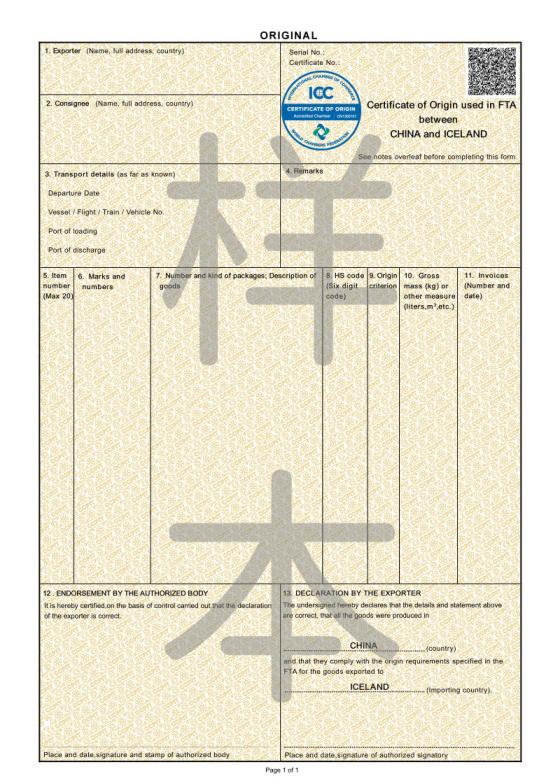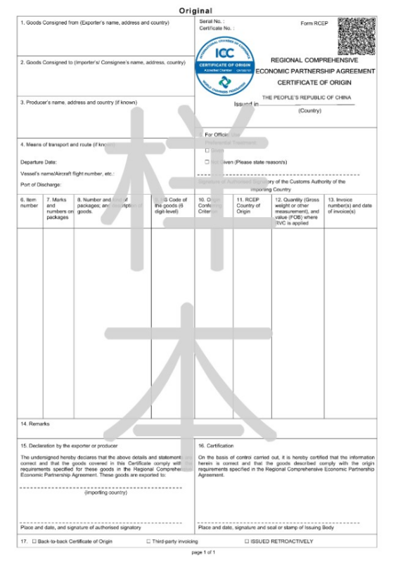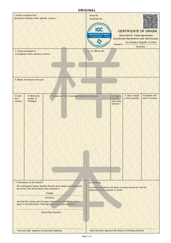 《区域全面经济伙伴关系协定》(简称RCEP)优惠原产地证书样本 东盟优惠原产地证书样本 智利优惠原产地证书样本 亚太优惠原产地证书样本 格鲁吉亚优惠原产地证书样本 新西兰优惠原产地证书样本 秘鲁优惠原产地证书样本 新加坡优惠原产地证书样本 海峡两岸优惠原产地证书样本 哥斯达黎加优惠原产地证书样本 瑞士优惠原产地证书样本 冰岛优惠原产地证书样本 澳大利亚优惠原产地证书样本 韩国优惠原产地证书样本 巴基斯坦优惠原产地证书样本 毛里求斯优惠原产地证书样本 柬埔寨优惠原产地证书样本
