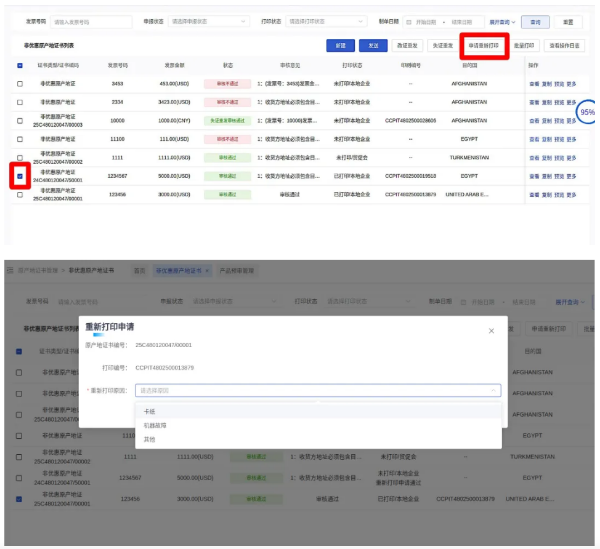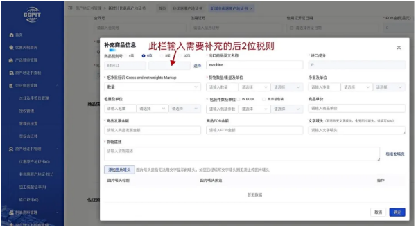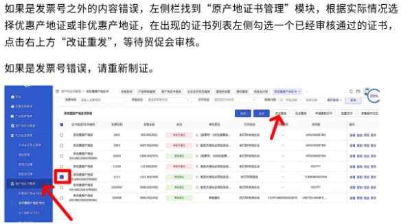 01 已审核通过的证书填写错误怎么办? 如果是发票号之外的内容错误,左侧栏找到“原产地证书管理”模块,根据实际情况选择优惠产地证或非优惠产地证,在出现的证书列表左侧勾选一个已经审核通过的证书,点击右上方“改证重发”,等待贸促会审核。 如果是发票号错误,请重新制证。 02 已审核通过的证书打印失败怎么办? 左侧栏找到“原产地证书管理”模块,根据实际情况选择优惠产地证或非优惠产地证,在出现的证书列表左侧勾选一个已经审核通过的证书,点击右上方“申请重新打印”,理由选“卡纸”,无需贸促会审核即可重新打印。 03 客户要求显示8位/10位税则号怎么办? 系统默认显示6位税则号,如需要显示8位税则号,在“添加商品-选择预审产品”找到“补充商品信息”页面。在商品税则号栏选择8位,并在下方空白栏补充后2位税则号。显示十位税则号同理。 04 起运港/目的港下拉菜单没有我想选择的港口怎么办? 在起运港栏第二列,任意选择一个港口,在第三列将所选港口名称改为实际想要选择的港口名称。 例如,起运港为安徽合肥,但下拉菜单中没有这一选项,在第二列选择“八所港”,在第三列将“BASUO CHINA”手动改为“HEFEI CHINA”,不要加逗号,点击空白处,自动生成运输路线。 目的港同理。 (来源:山东贸促)