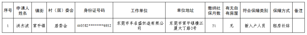 根据《东莞市住房体系建设实施意见》(东府〔2018〕99号)、《东莞市公共租赁住房管理办法》(东府〔2019〕37号),现对申请对象的基本情况进行公示,任何组织或个人对公示的情况有异议的,应当在公示期内书面向常平镇人民政府住房规划建设局提出,反映人需署真实姓名以便调查,否则作异议无效处理。(以下名单将从2021年6月24日起至2021年7月3日止,在常平镇政府公众网上公示10天,网址:(http://www.dg.gov.cn/cp/)