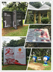 常平镇法治文化主题公园将湖心岛着力打造的“宪法岛”,作为我镇重要的宪法学习阵地,普及宪法精神,传播法治文化。岛上包含“立式宪法书雕塑”、“宪法路”、“宪法亭”等法治景观,在公园中心岛入口处放置宪法雕塑,宣传宪法誓词等内容,在岛上的林间小路两侧放置宣传牌,以图配文的形式,向群众讲解我国宪法的发展历程,形成一条既严肃又生动的“宪法路”。宪法路将“宪法亭”与“平安课堂”连接在一起,“宪法亭”廊檐下悬挂宪法格言名句,常平司法分局定期邀请普法讲师团成员在平安课堂为群众讲授法治、平安文化知识。另外,岛上还放置了我们常平普法的代言人“平娃”的雕塑,以其可爱的造型吸引群众驻足观看拍照。