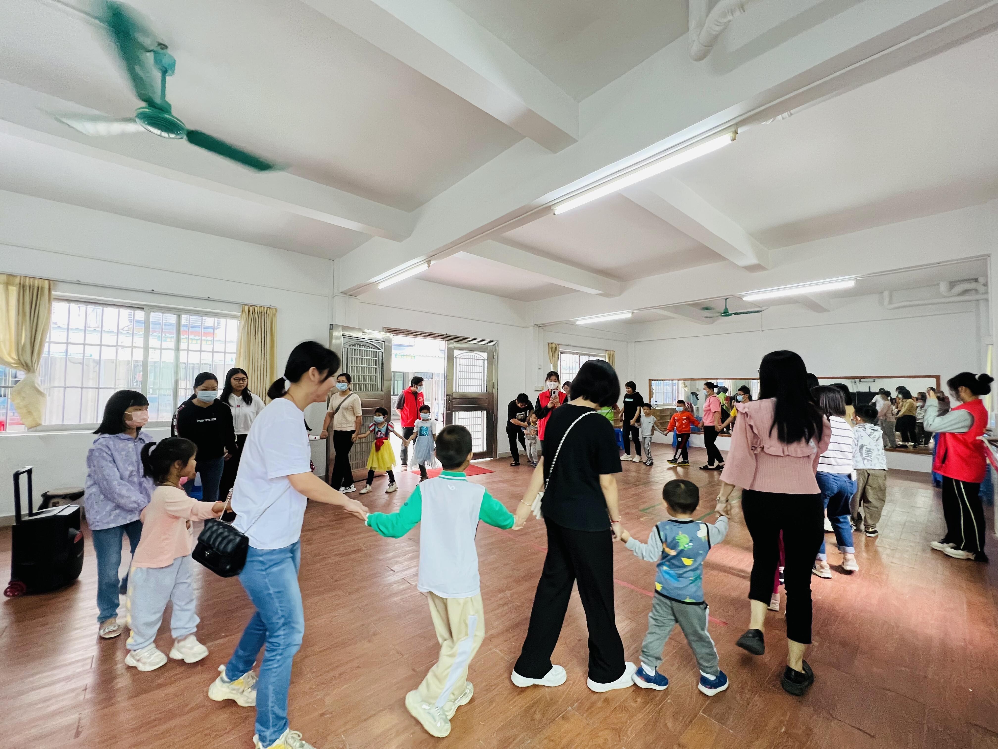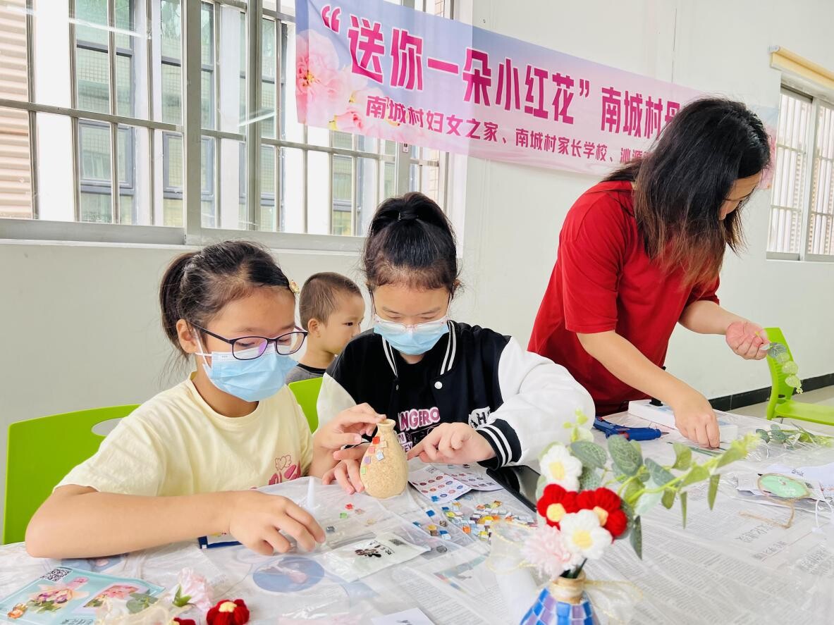 此次活动主题是分三个环节,第一环节热身运动《抓泥鳅》,首先社工指引大家围成圆圈一起走。由志愿者主持并播放音乐,听到“抓泥鳅”歌词都要蹲下来;接着,第二环节亲子游戏互动,是二人三足,在游戏场地设置好起点和终点,分为三组同时进行,每组五对亲子家庭,用一根长绳将妈妈和孩子相邻的一条腿绑在一起,听到口令后,妈妈和孩子一起出发向前跑,到终点线后返回,以最先返回到起跑线小组为胜。大朋友、小朋友都玩得不亦乐乎;第三阶段巧手制作花朵和花瓶,孩子们通过自己的小手,亲手为妈妈做节日礼物。首先社工展示了花朵和马赛克花瓶的成品,并介绍制作流程和注意事项。花瓶由参加者根据自己不同的思路制作。经过一小时的制作,一个个自己亲手做的花瓶、花朵都呈现在眼前。