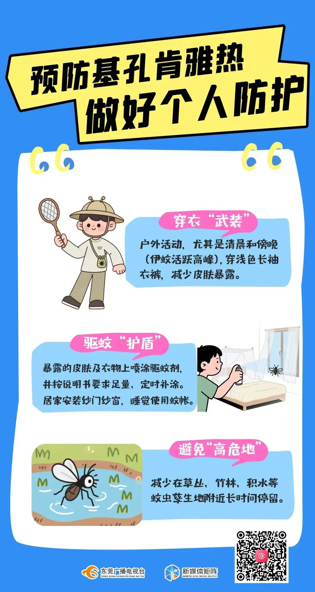 公众不必恐慌!登革热、基孔肯雅热主要通过蚊媒叮咬传播,不会直接人传人。