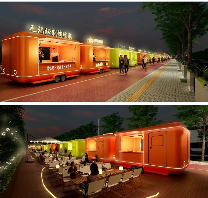 据了解,该摊规点规划占地面积约3000平方米,规划设置55个摊位,分别有8平方米、12.6平方米、21平方米三种规格的餐车供摊贩选择,并配备公共就餐区、停车区域等。项目负责人刘智凯说,“我们设计的餐车是靠人行道,公共的座位区域是在靠墙围墙的范围,这样就更安全。”