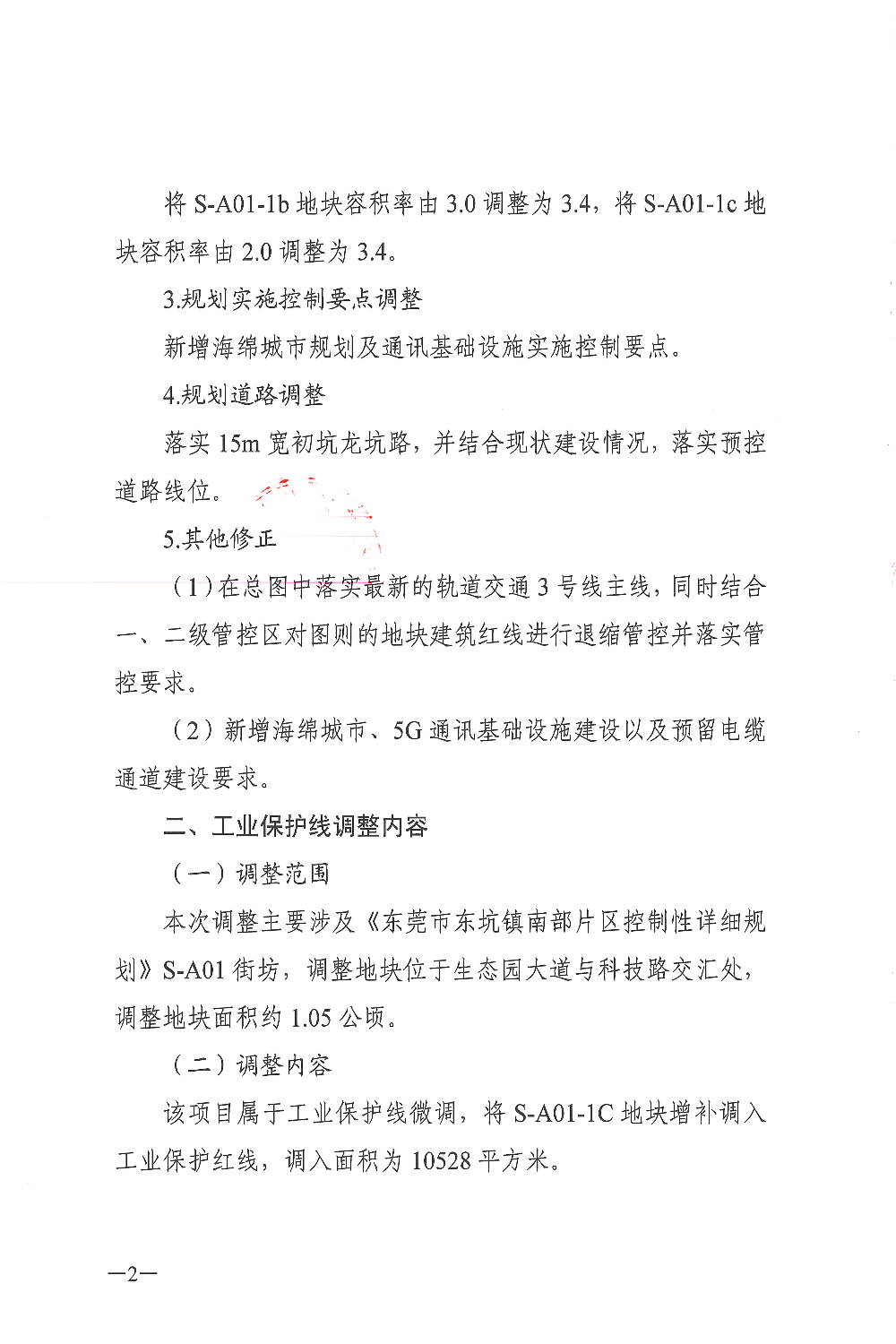关于发布东莞市东坑镇南部片区控制性详细规划S-A01街坊及工业保护线调整的批后公告