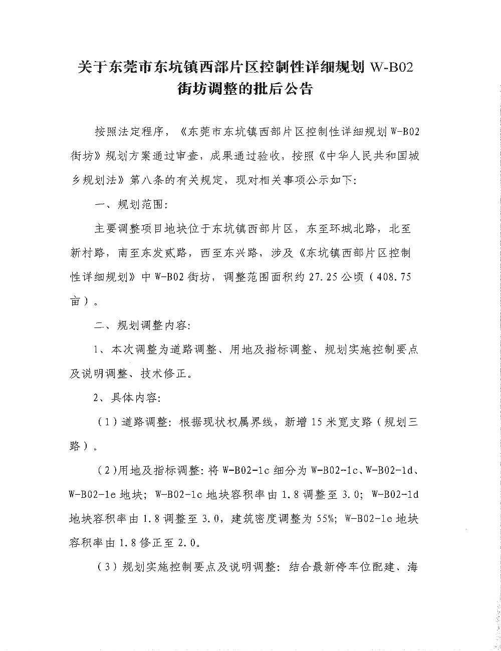 关于东莞市东坑镇西部片区控制性详细规划W-B02街坊调整的批后公告
