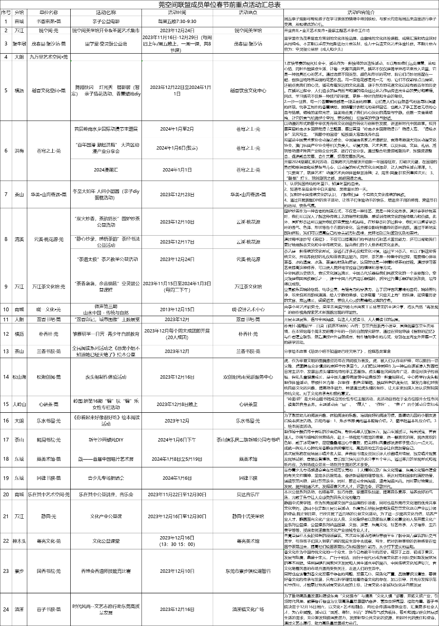 当天,“·莞”空间联盟还发布了“点亮莞空间”主题活动,将在春节前打造阅·好时光、艺·彩缤纷、童·趣无限三大板块精彩纷呈的活动。同时,稻香文化空间·莞、华美·山海奇遇·莞、云溪·桃花源·莞、锐空间·莞、晓一文化·莞、书香南苑·莞多家联盟成员单位强强联动,同步启动“乐享书适圈 点亮莞空间”——书式阅读马拉松活动。各新型公共文化空间继续各出奇谋,合力发展,让生活书香满溢,让阅读荡漾全城。
