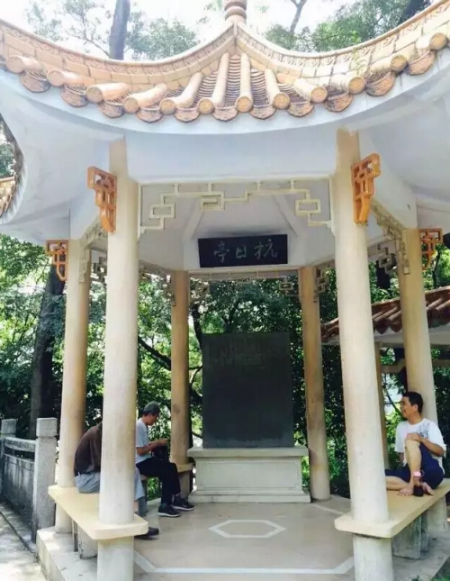 为纪念东莞抗日模范壮丁队建队50周年,1988年10月东莞市人民政府于人民公园盂山顶北侧的当年东莞模范壮丁队成立之处建抗日亭,以铭先烈,以勉后人。
