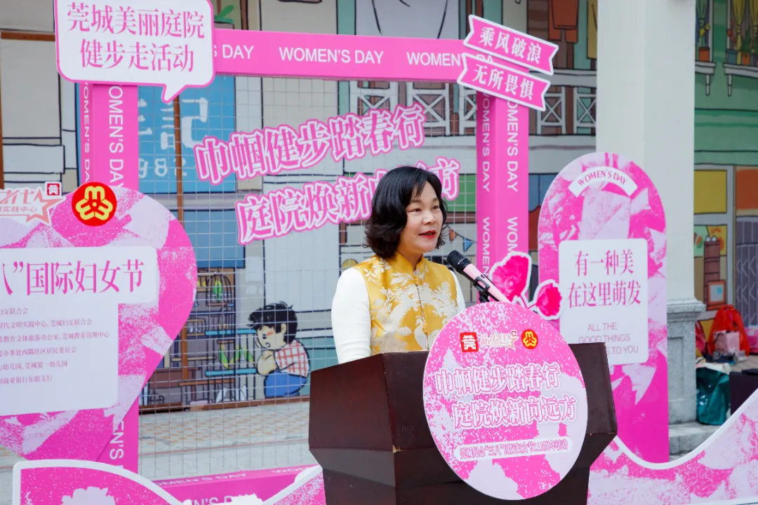 3月8日,为传播积极健康生活方式,加深广大群众对莞城城市建设的自豪感和认同感,莞城街道举行“巾帼健步踏春行 庭院换新向远方”美丽庭院健步走暨纪念第115个“三八”国际劳动妇女节活动。此次活动得到东莞农村商业银行东联支行的大力支持。莞城街道党工委委员、妇联主席张永红,人大工委副主任张庆君参加活动。