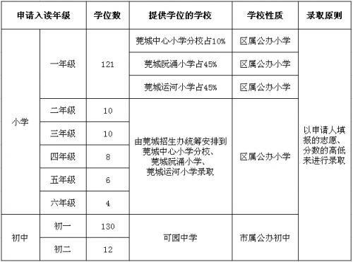 2015年莞城区新莞人子女积分制入学学位供给情况公布
