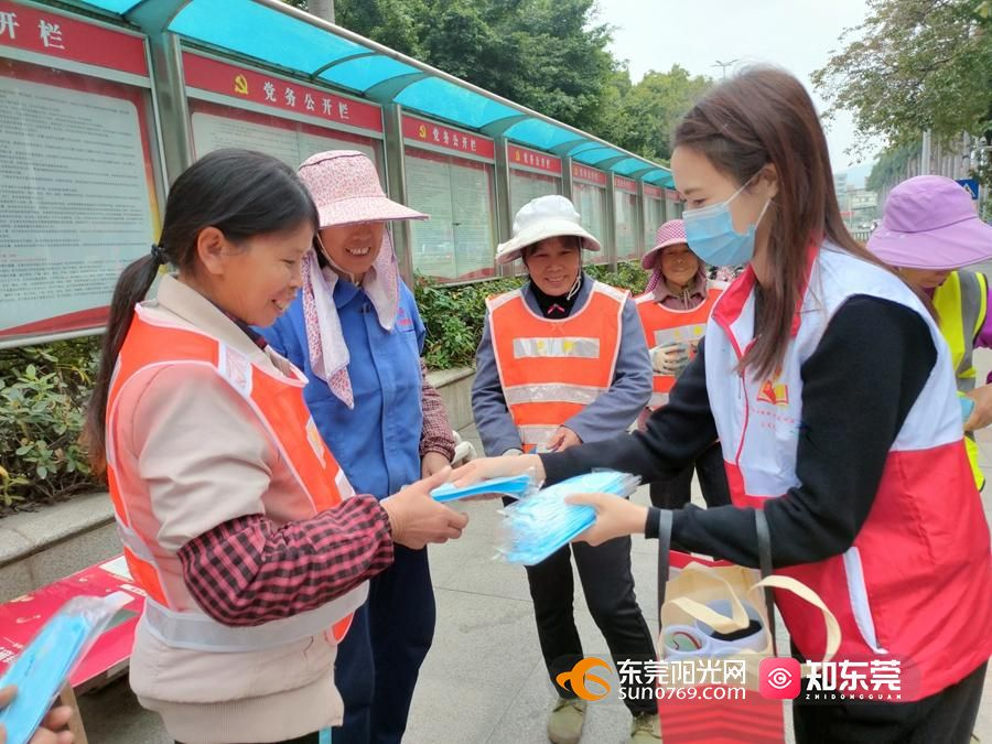 志愿者们分别于新时代文明实践中心、图书馆、市场、商场、大岭山广场、体育公园,为过往的环卫工人、保安、行人、市场摊主等市民派发口罩,劝导身边未戴口罩的市民戴好口罩,并在活动现场使用喇叭播放科学防疫宣传音频,营造现场活动氛围。