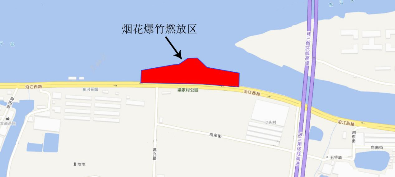 6.石碣镇可以燃放的区域。如图6红色区域所示,设在石碣镇梁家村公园,昌兴路与沿江东路交汇口—沿江东路沿线以北—梁家村公园西侧通道交汇口—梁家村公园西侧沿线以东—东江支流交汇口—东江支流沿线以南—梁家村公园东侧通道交汇口—梁家村公园东侧沿线以西—昌兴路与沿江东路交汇口,以现场指示区域为准。