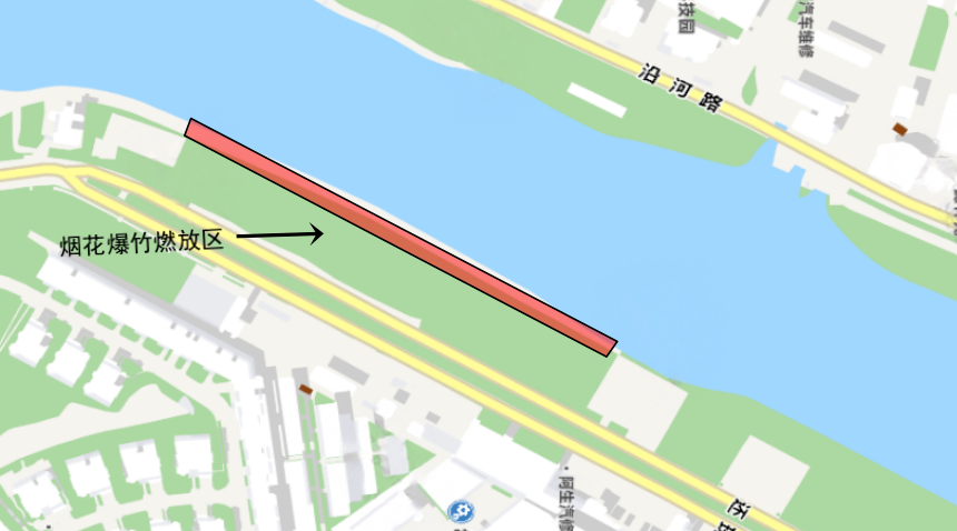 9.洪梅镇可以燃放的区域。如图9红色区域所示,设在河西梅新路梅沙石狮子公园河堤段,长度约130米,以现场指示区域为准。