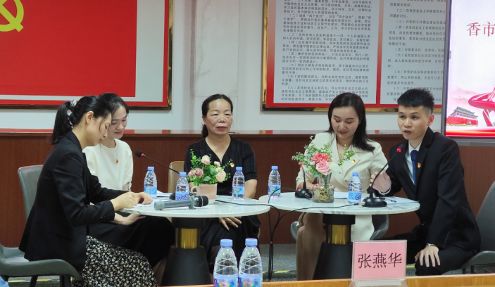 本次培训班以圆桌访谈形式进行,寮步法庭法官助理刘心主持,寮步法庭副庭长王锦兰、全国模范人民调解员张惠欢律师、西溪村调解主任尹婉媚、驻横坑社区法律顾问钟德坤律师作分享嘉宾。