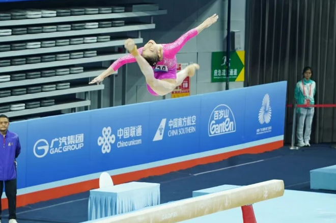 在东莞体校打下坚实基础后,柯沁沁凭借出色的表现入选广东省体操队,进入了更为专业和系统的训练阶段。她的技术更加精细,体能和力量也显著增强,开始在各类青少年比赛中崭露头角。本届全运会周期,她的进步尤为神速,逐渐在国内赛场上展现出竞争力。