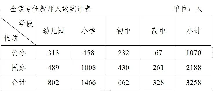 全镇专任教师3258人,其中幼儿园802人,小学1466人,初中662人、高中328人。公办学校(幼儿园)专任教师1070人,其中幼儿园313人、小学458人、初中232人、高中67人;民办学校(幼儿园)专任教师2188人,其中幼儿园489人、小学1008人、初中430人、高中261人。