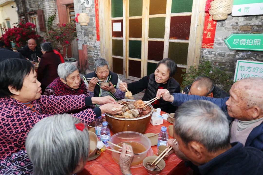 “开餐啦!”当日傍晚6时,在美丽的水南村休闲公园,随着鞭炮齐鸣,交盘会正式开始。120多张餐桌依次铺开,900多名老人欢聚一堂,共同享用寓意着吉祥康瑞的“盆菜宴”。宴席上,老人们喜笑颜开,一边吃着美味可口的盆菜,一边聊家常、叙乡情,畅谈村里的新变化。