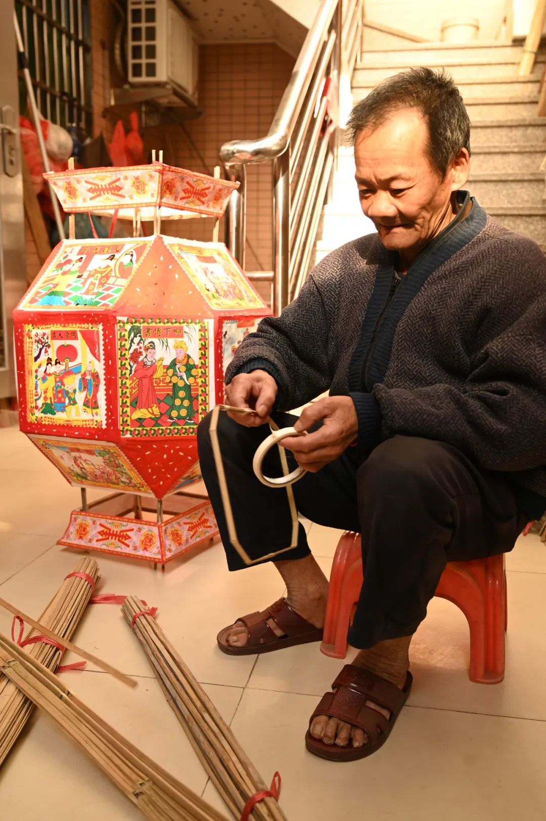 “破竹子、扎制骨架、贴上‘公仔纸’……”梁帝安介绍,别小看这花灯,花灯制作的工序看似简单,却需要极具耐心。制作一盏挂在客厅用的普通花灯大约两个小时,大型花灯的制作更费时费力。