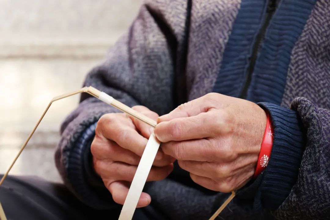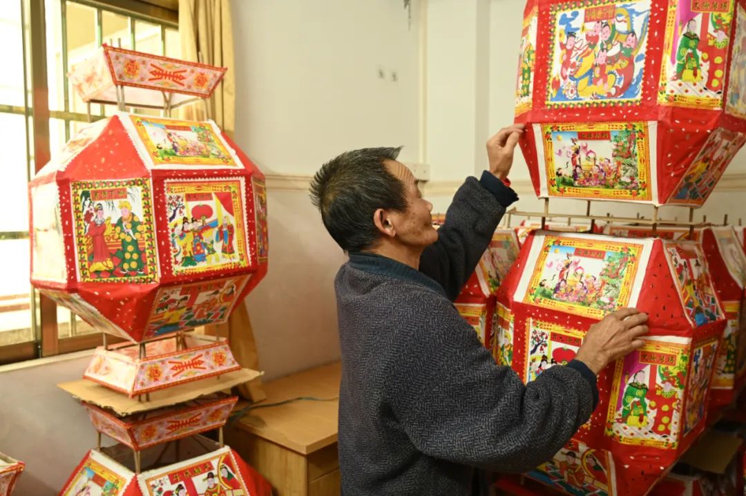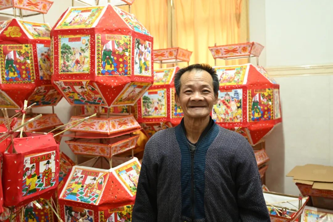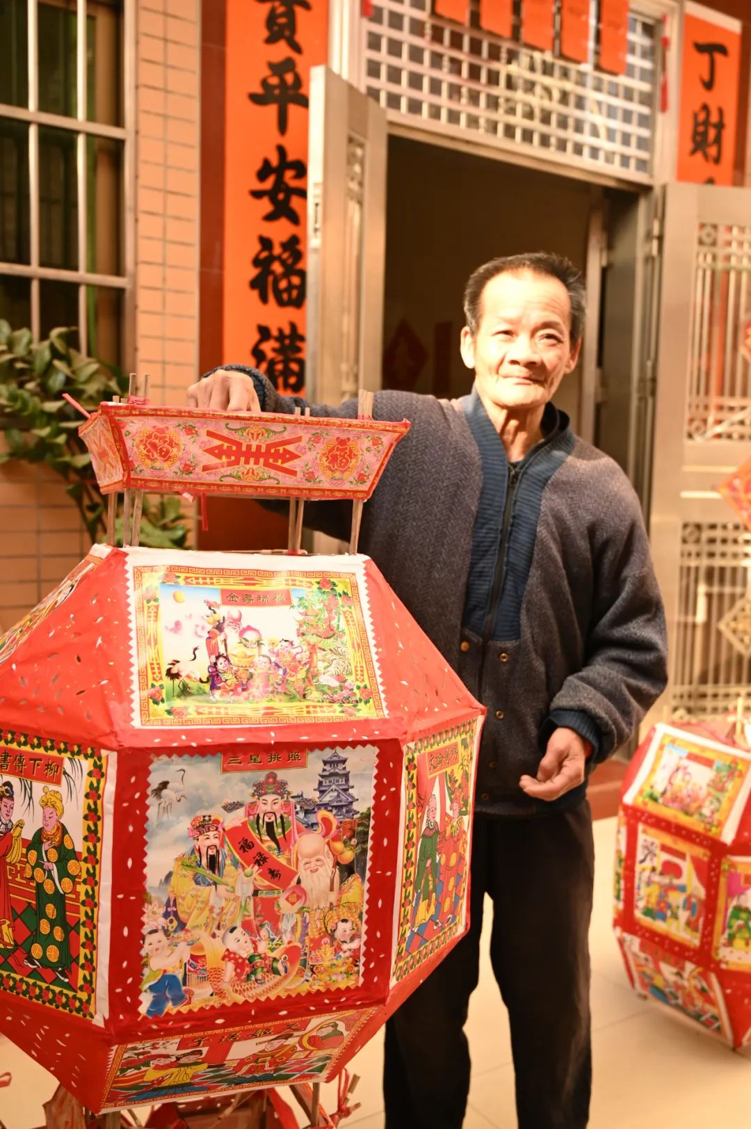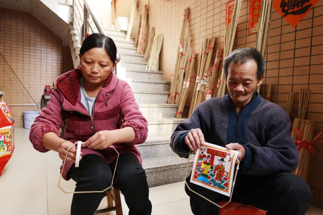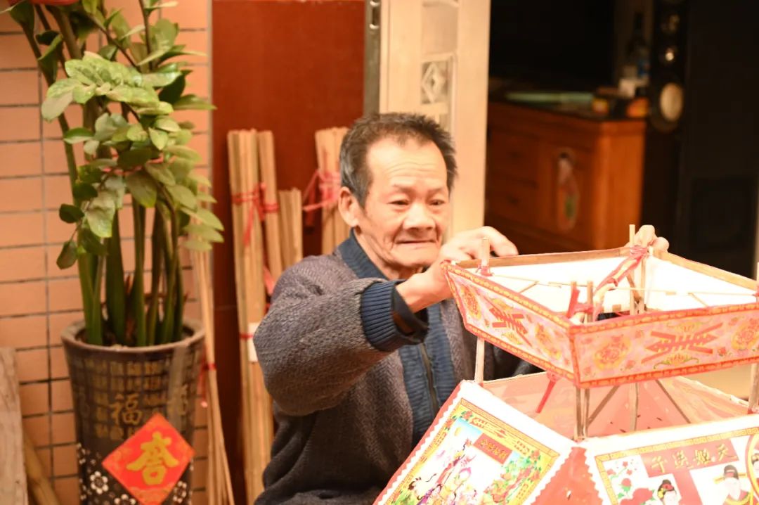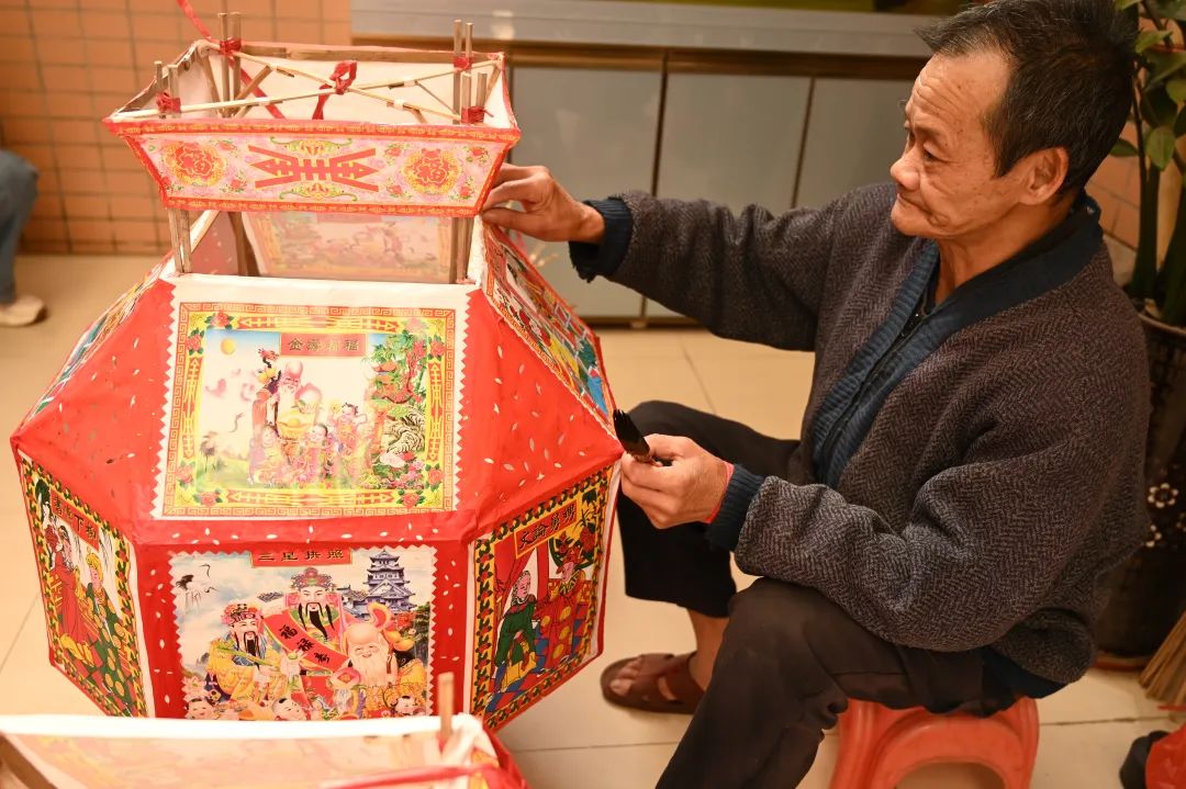 今年,儿媳单凤清也参与花灯制作,跟着梁帝安学艺。“那些比较大的花灯,我还不会做,体积小的、简单的,我可以帮一下忙。”单凤清拿着破好的竹子,小心翼翼地掰出棱角,用胶带扎成灯架,再确认是否扎实,而后将一幅幅“迎春接福”“天姬送子”“灯花报喜”等“公仔纸”粘贴到灯架上。