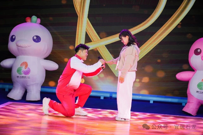 当晚,十五运会吉祥物“喜洋洋”“乐融融”人偶早早在领奖台等候,工作人员手拎寓意美好的石龙花灯,带领刘焕华的伴侣缓缓走向举重赛场中央的领奖台。刚刚夺得男子102公斤级决赛金牌的刘焕华眼神满含深情:“备战全运会的日子里,感谢你一直以来默默的支持与陪伴。”深情告白引发全场阵阵掌声,现场氛围温馨动人。现场,刘焕华的伴侣眼含热泪、点头答应,刘焕华小心翼翼地为她戴上戒指,两人紧紧相拥。随后,刘焕华与伴侣携手向在场所有人员派喜糖——李全和麦芽糖柚皮,把这份浸润着石龙非遗风味的喜悦传递给每一位见证者。