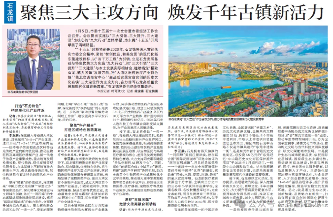 “‘十五五’时期特别是2026年,石龙镇将深入贯彻落实市委全会精神,紧扣‘智创优品、和美宜居’的现代化新东莞建设目标,以‘百千万工程’为引领,立足石龙发展基础与特色优势大力实施‘九大行动’,把‘三大引领’‘三大提升’‘三大建设’与本土发展实际相结合,继续锚定‘精致石龙、魅力名镇’发展方向,将‘大湾区医药医疗产业特色镇’‘莞北交通商贸中心’‘高品质宜居宜商宜创的历史文化名镇’三大定位作为主攻方向,奋力谱写石龙高质量发展和现代化建设新篇章。”石龙镇党委书记李亚鹏表示。