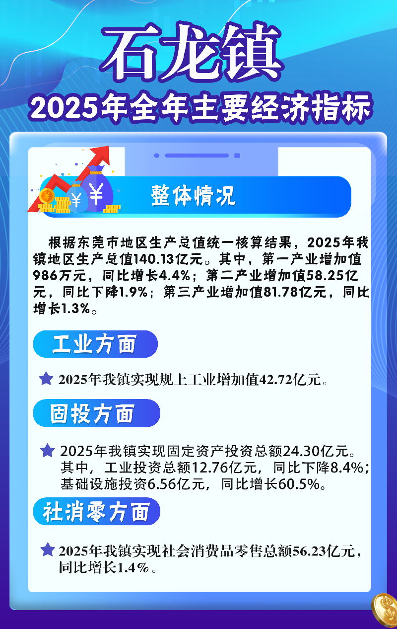 根据东莞市地区生产总值统一核算结果,2025年我镇地区生产总值140.13亿元。其中,第一产业增加值986万元,同比增长4.4%;第二产业增加值58.25亿元,同比下降1.9%;第三产业增加值81.78亿元,同比增长1.3%。