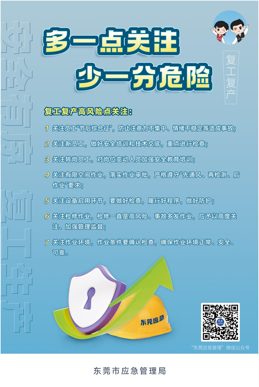 节后复工复产时期历来是各类生产安全事故的高发期、易发期,为切实做好春节假期后复工复产安全生产工作,防范遏制各类生产安全事故,牢牢守住安全底线,石排镇安委办、石排应急管理分局提醒全镇各生产经营单位,要认真落实以下几点要求: