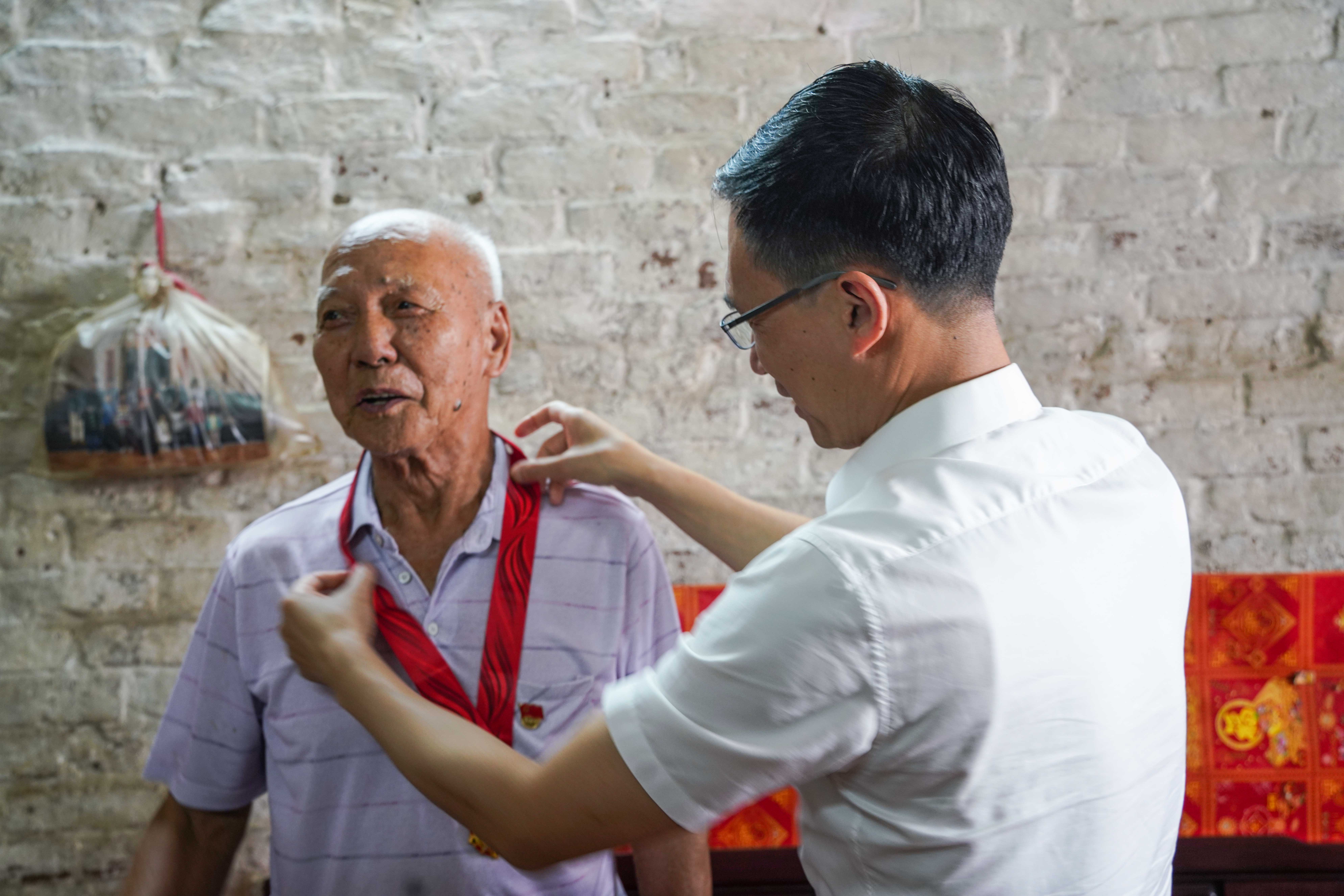 当天上午,梁杰钊一行来到中坑村老党员蔡海祺家中,亲切地与其拉家常,询问他的生活起居、身体健康、子女工作等情况,感谢他为党和国家事业作出的突出贡献,并送上慰问金和慰问品。其间,梁杰钊向蔡海祺颁发了“光荣在党50年”纪念章。