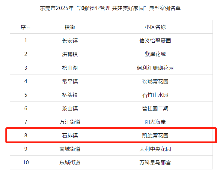 近日,东莞市住房和城乡建设局公布2025年“加强物业管理 共建美好家园”典型案例名单,石排凯旋湾花园物业住宅小区被评为十个典型案例之一。