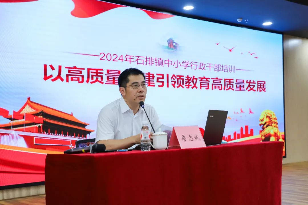 为加强党的领导和党的建设,加强教育系统思想政治工作体系建设,近日,镇教育管理中心主办的2024年石排镇中小学行政干部领导力培训在中心小学报告厅进行最后一场培训学习,石排镇党委书记詹志斌以高质量党建引领教育高质量发展为题讲授专题党课。石排镇副镇长李凤芳、教育管理中心成员、各公民办学校幼儿园的校长园长、行政干部参加学习。