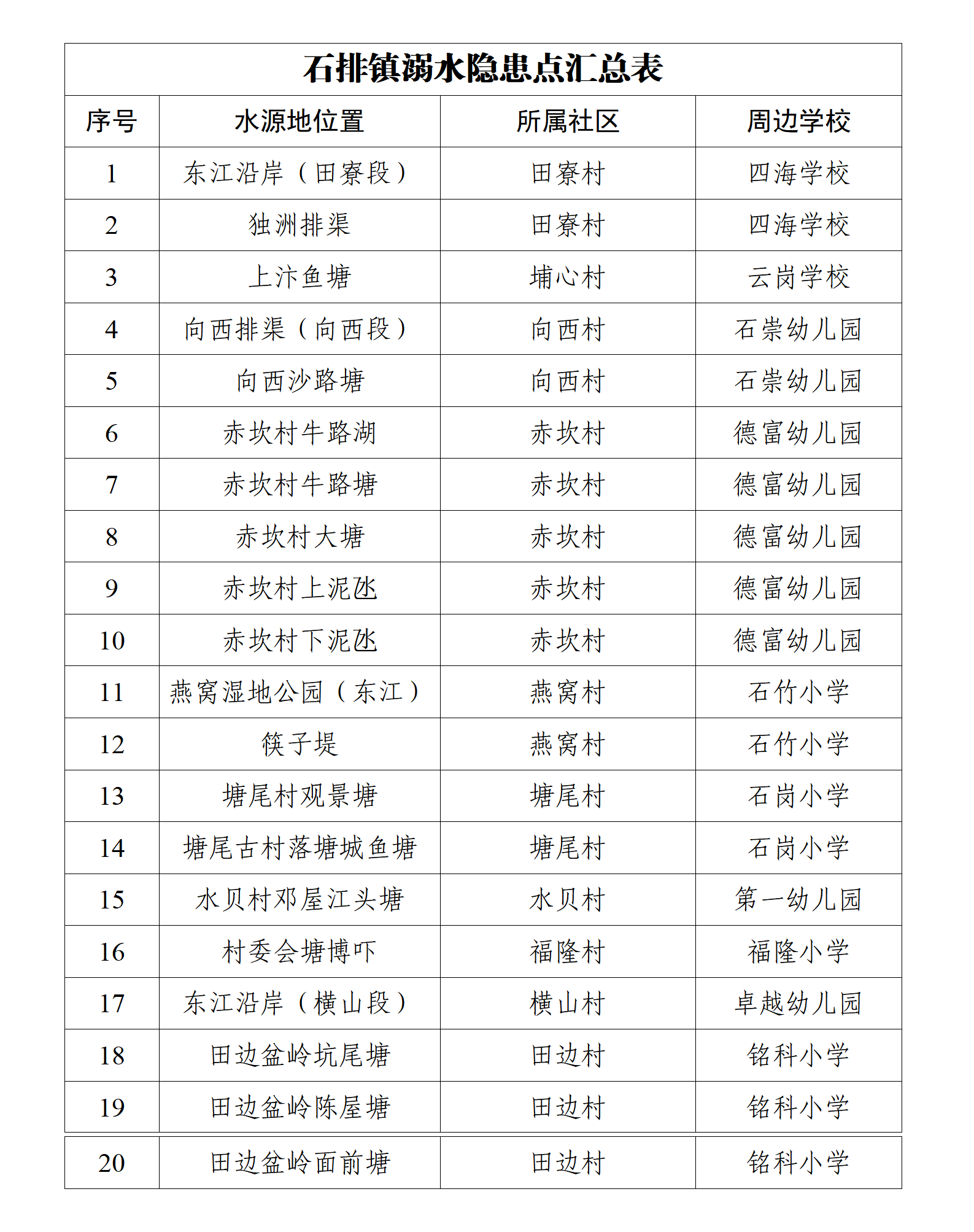 为切实筑牢防溺水安全屏障,石排镇教育管理中心联合各村(社区)、各相关部门,对全镇校园周边水域开展溺水隐患点“再排查、再完善”专项工作,共排查出校园周边溺水隐患点20处,现将具体信息向社会公开,请广大家长、师生密切关注,提高警惕,远离危险水域!