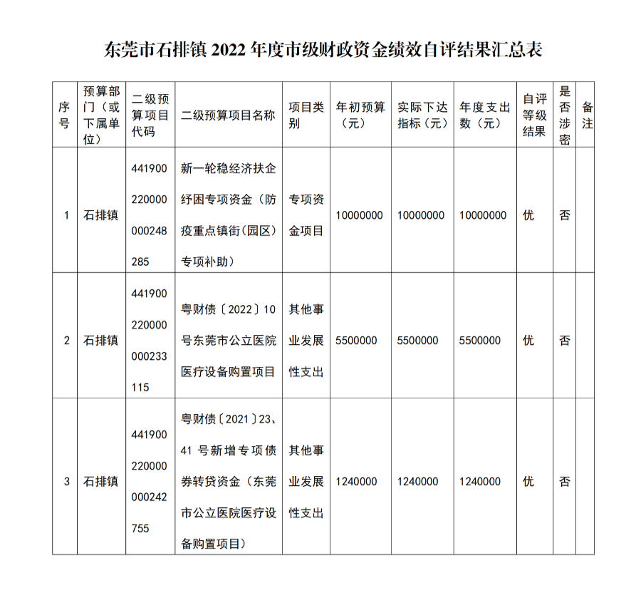 东莞市石排镇2022年度市级财政资金绩效自评结果汇总表