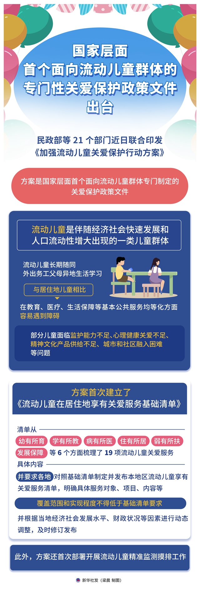 记者9月3日从民政部举办的第三季度例行新闻发布会上获悉,民政部等21个部门近日联合印发《加强流动儿童关爱保护行动方案》。方案是国家层面首个面向流动儿童群体专门制定的关爱保护政策文件。