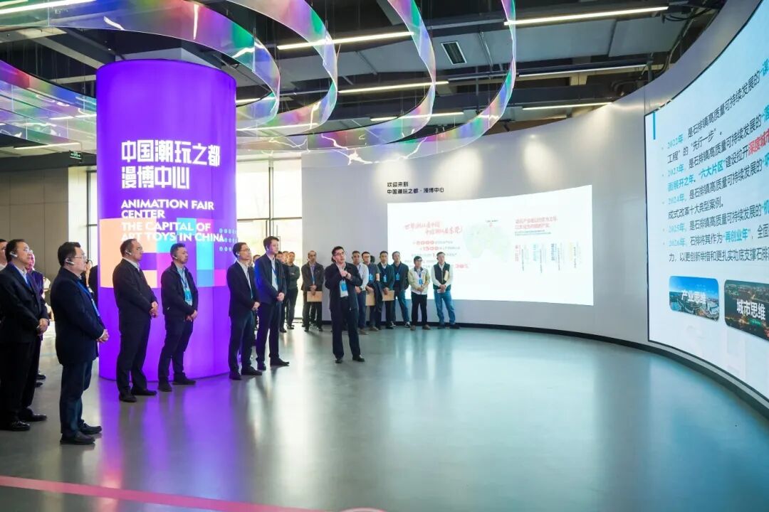 调研组首站走进中国潮玩之都·漫博中心,沉浸式感受石排潮玩产业的集群活力。通过参观企业特装展厅,详细了解石排“5+2”全链条产业生态体系,以及漫博中心“专业展+专业镇”的运营思路和“4天展会+365天园区运营”的展产融合模式。调研组对石排以漫博会为纽带,打造全国潮玩产业高地的做法表示认可。2025年,石排首次承办国家级漫博会,吸引600多家企业机构参展,意向合作金额达15.6亿元,线上线下展销额1.8亿元,国庆文旅联动活动更带动消费1.14亿元,“前展后厂”模式大幅提升产业转化效率,为特色产业赋能提供了有力支撑。