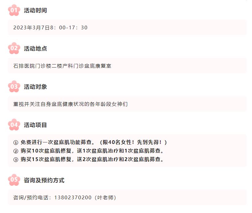 3月7日,石排医院妇产科将开展关注妇女盆底健康活动,为女神们带来健康关怀!具体事项如下: