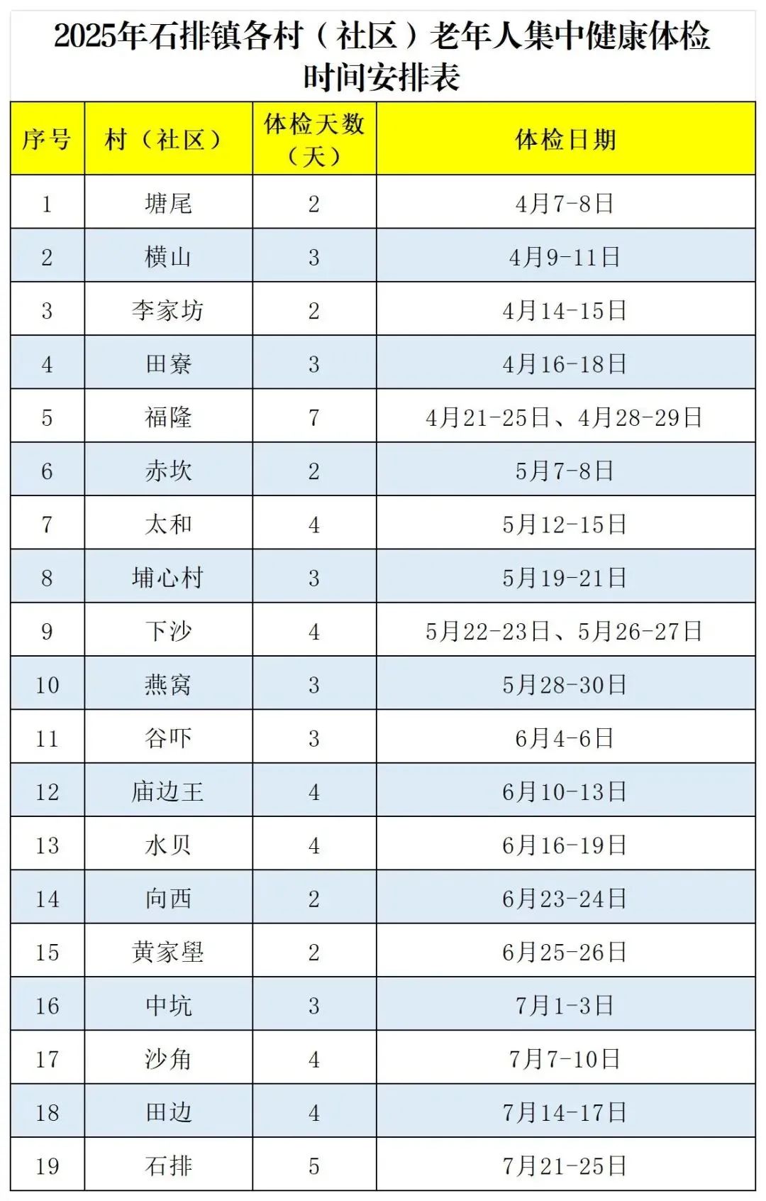 4月开始,石排镇老年人集中免费体检,目前正在火热进行中!国家基本公共卫生服务项目,老年人免费体检免费。
