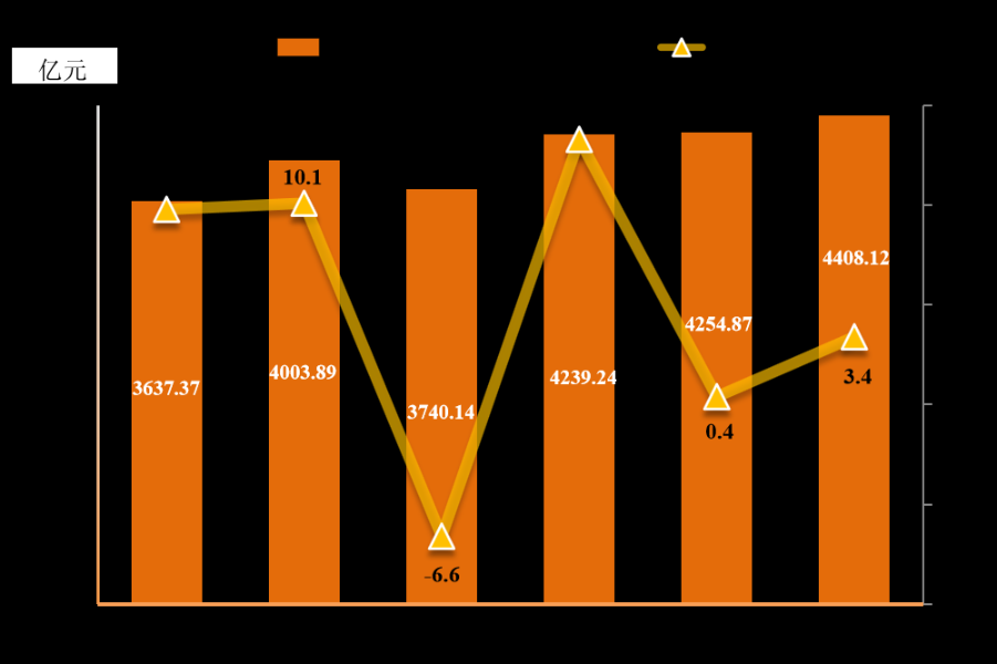 全年社会消费品零售总额4408.12亿元,比上年增长3.4%。分经营地看,城镇消费品零售总额3967.62亿元,增长3.0%;乡村消费品零售总额440.49亿元,增长7.2%。分消费形态看,商品零售额4026.50亿元,增长2.8%;餐饮收入381.62亿元,增长10.4%。