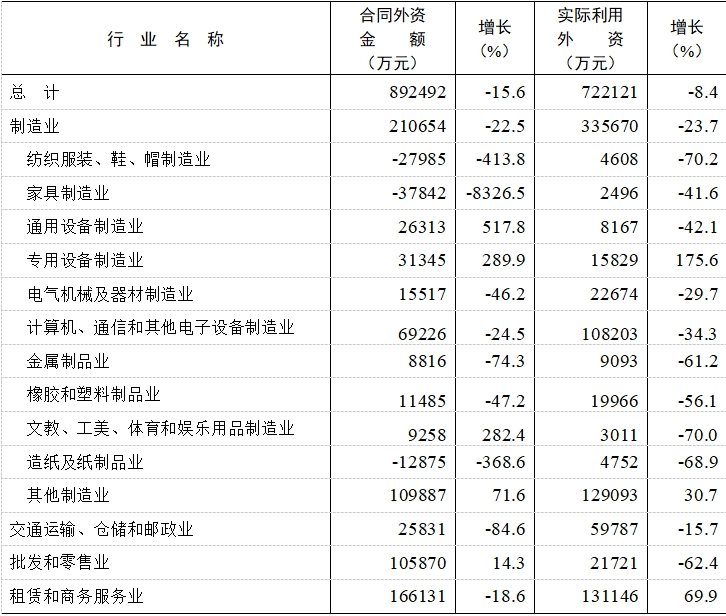 全年全市新签外商直接投资项目1369宗,合同外资金额89.25亿元,比上年下降15.6%。实际利用外资72.21亿元,下降8.4%。其中,制造业实际利用外资33.57亿元,下降23.7%,占全市实际利用外资比重46.5%。