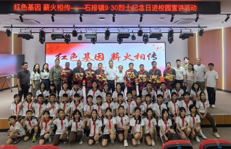 9月30日,石排镇退役军人服务中心联合镇武装部、团委,在石岗小学开展“9・30”烈士纪念日进校园宣讲活动,310名师生参与。现场布置“十大英模”及新时代英雄烈士生平简介展板,主持人介绍纪念日意义,老班长工作室负责人权叔讲述战斗故事,少先队员为老前辈佩戴红领巾、送上鲜花,石排镇退役军人服务中心负责人寄语学生传承红色基因、助力民族复兴。