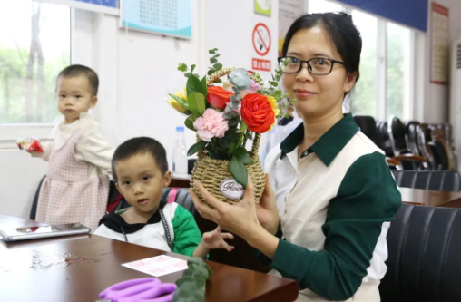 活动现场花香四溢,工作人员精心准备了花篮和康乃馨、玫瑰、雏菊等鲜花,并邀请了花艺师向现场的妈妈们详细讲解花枝修剪方法、造型和搭配技巧。