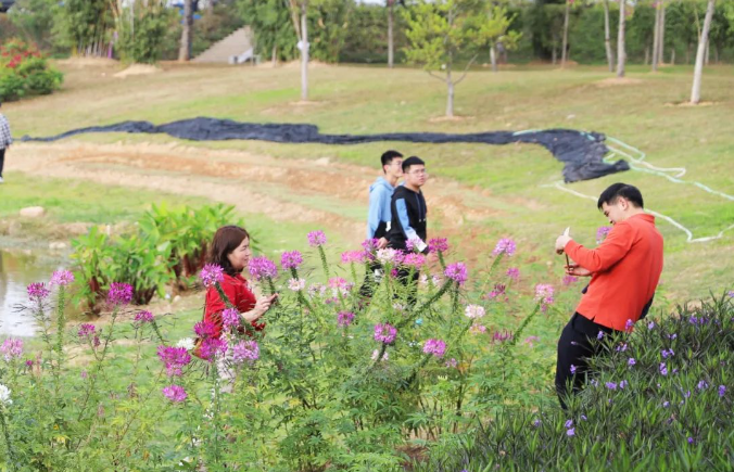 走进公园,道路两旁的各式花朵五彩缤纷,游客们三三两两地边赏景边拍照,还有不少大家庭出游,围坐在一起品美食晒太阳,喜乐祥和。