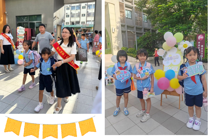 谢岗镇第一小学在校门口装点彩色气球,教师团队引导新生入校。