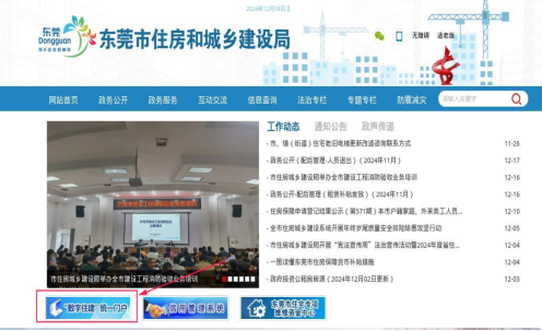 申购人可在2026年3月12日起登录网址:东莞市住房和城乡建设局http://zjj.dg.gov.cn/,点击“数字住建”统一门户图标进入,如下图: