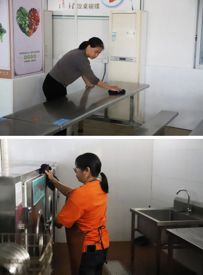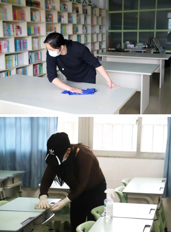 从走廊到教室,从图书馆到食堂,处处可见老师和家长们忙碌的身影。他们有的拿着拖把,认真拖洗走廊地板;有的挥动扫帚,仔细清扫校园落叶;有的戴着橡胶手套,用消毒液为每一张课桌清洁消毒;还有的在食堂里忙碌,反复擦洗消毒柜、仔细冲洗厨具,不放过任何一个细节。