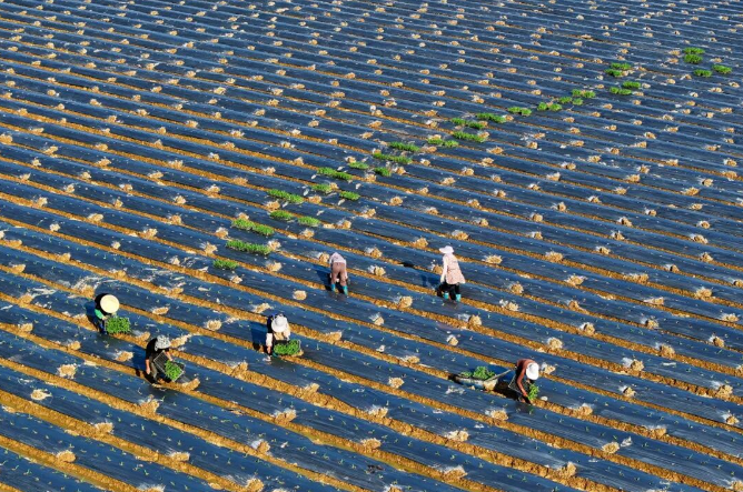 12月24日,记者在黎村连片高标准农田看到,育苗棚内,工人正细致地为玉米幼苗浇水,确保苗齐苗壮。不远处的农田里,农户们有的在清理垄沟,铺设地膜;有的将翠绿的玉米幼苗移栽入地膜孔洞中;有的为已定植的玉米苗施用水肥,田间作业繁忙而有序。