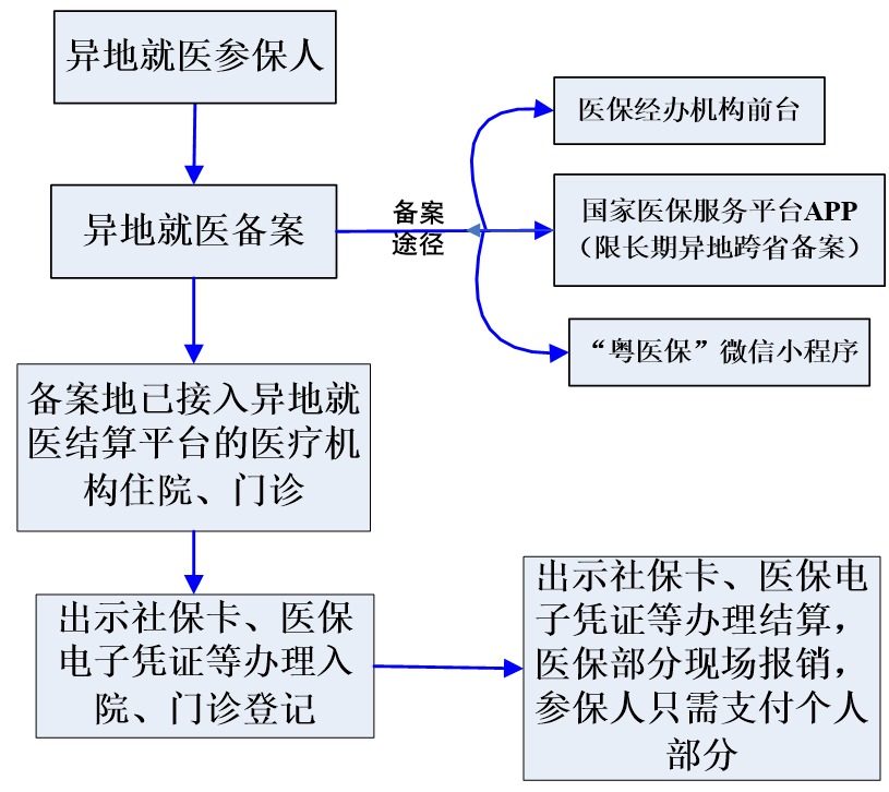 ② 可通过国家医保服务平台APP、粤医保和粤省事微信小程序线上办理异地就医备案手续。
