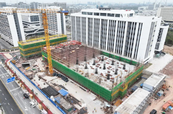 走进利扬通信智能制造中心项目现场,可以看到一片繁忙而有序的景象,高耸的塔吊来回转动,将一捆捆钢筋、一块块模板精准地吊运到指定位置,工人们正在进行钢筋绑扎,模板搭建,做好浇筑前的准备工作。