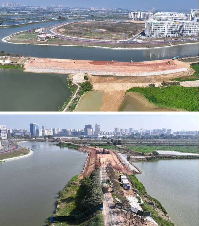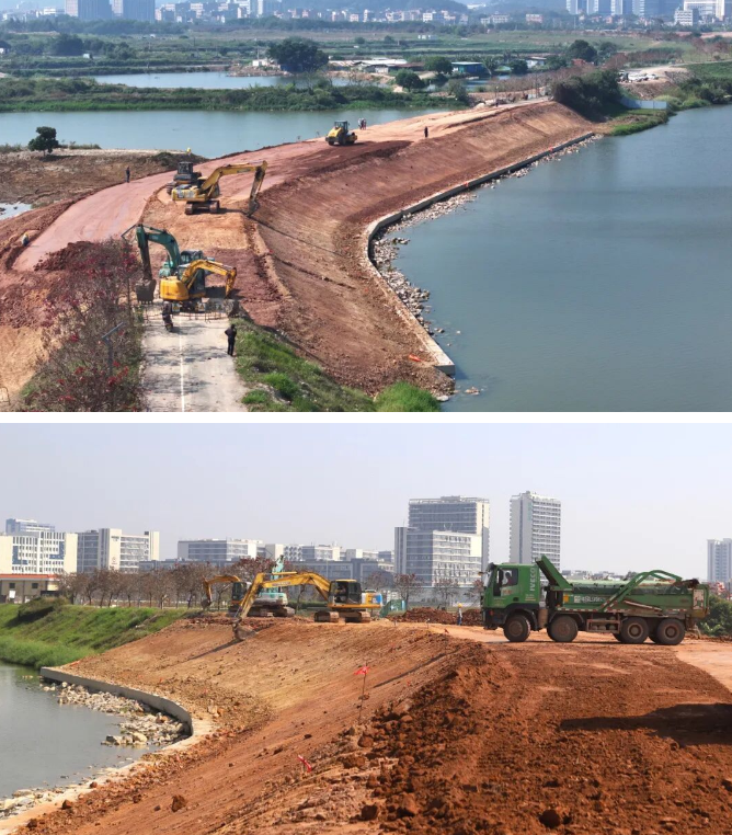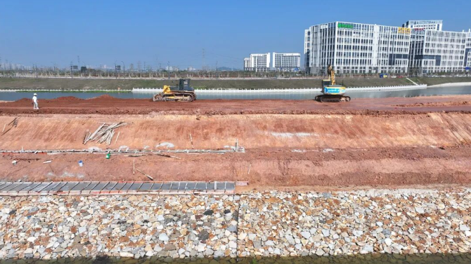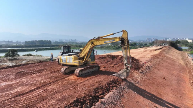 在东莞市谢岗镇谢岗堤围滑塌段修复工程建设现场,推土机、挖掘机、压路机、翻斗车等大型机械设备往来穿梭,施工人员正抢抓晴好天气加紧作业,全力以赴推进工程进度,现场呈现一派热火朝天的繁忙景象。随着各项建设任务的有序推进,堤围主体工程已基本成形,整体轮廓愈发清晰。