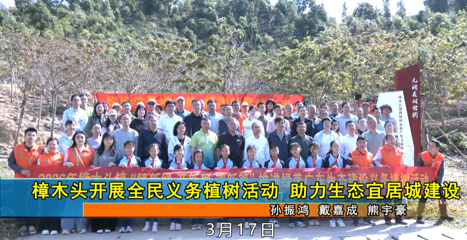 3月17日,樟木头2026年全民义务植树暨镇村级林长植树活动在九洞森林公园举行,近百名参与者携手植绿添彩。
