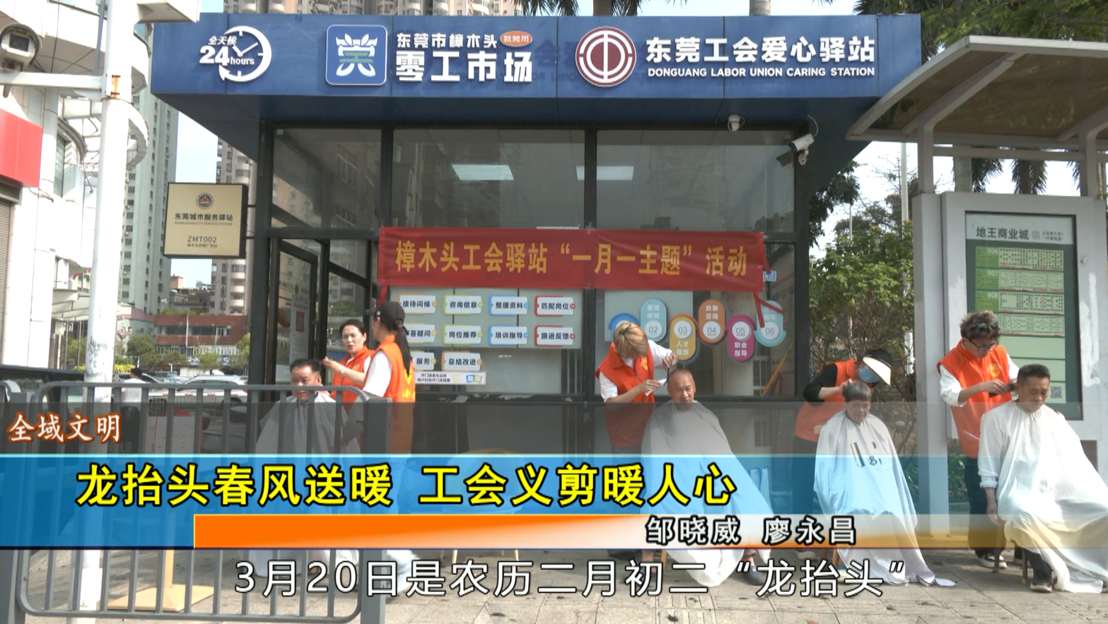 3月20日是农历二月初二“龙抬头”,樟木头镇总工会在西城广场工会爱心驿站开展“春风义剪暖人心”活动,为环卫工人、快递员、外卖骑手等户外劳动者提供免费理发服务,将工会“娘家人”的关怀送到职工身边。